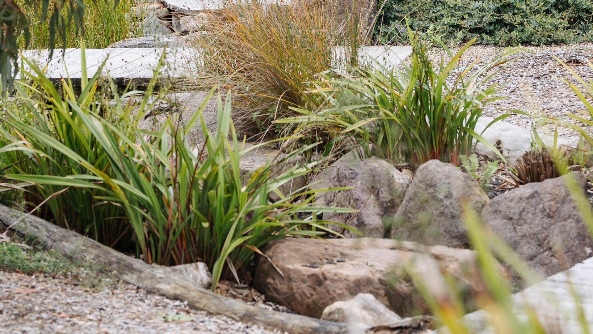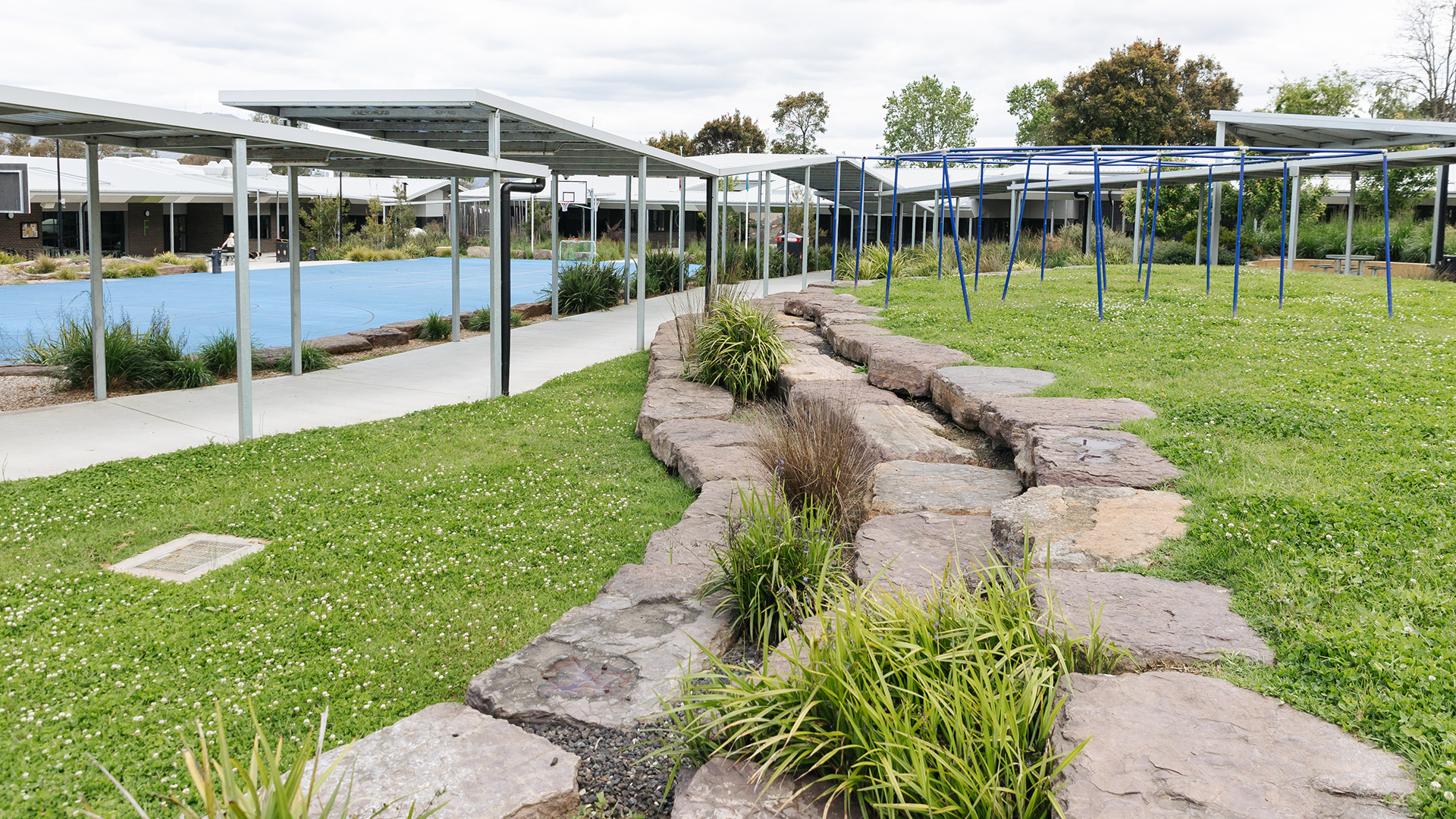 - Decorative drainage and crushed rock to support resilient lawns and high-use play zones