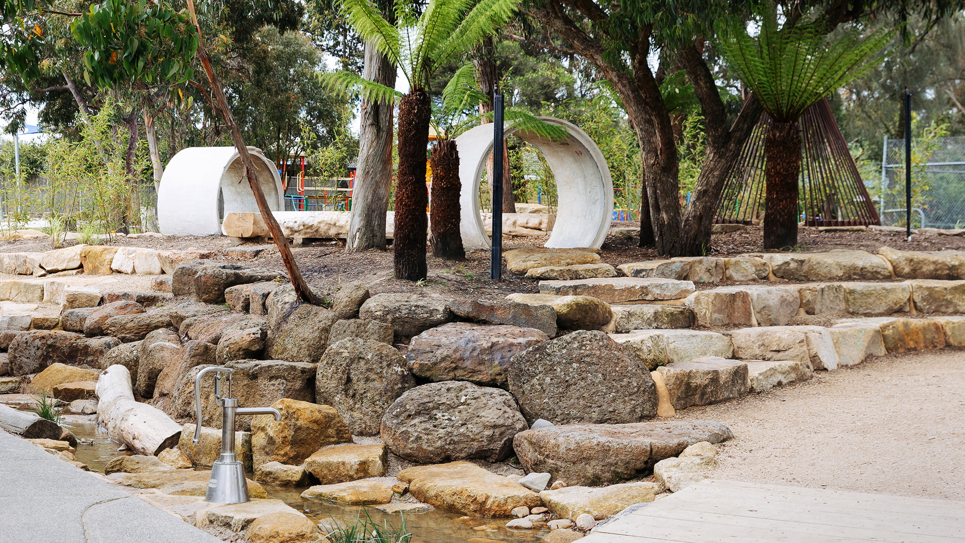 - Nature-play boulders with safe edge profiles